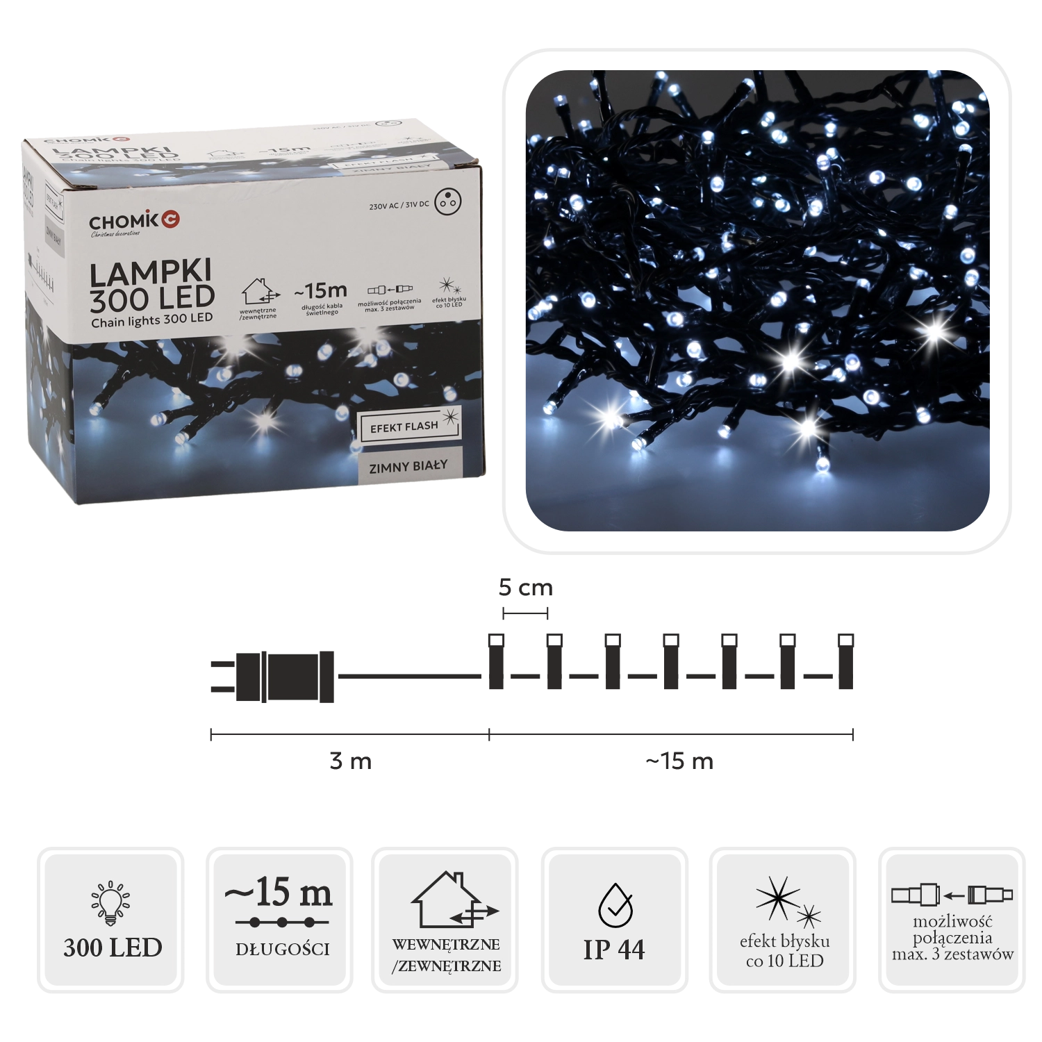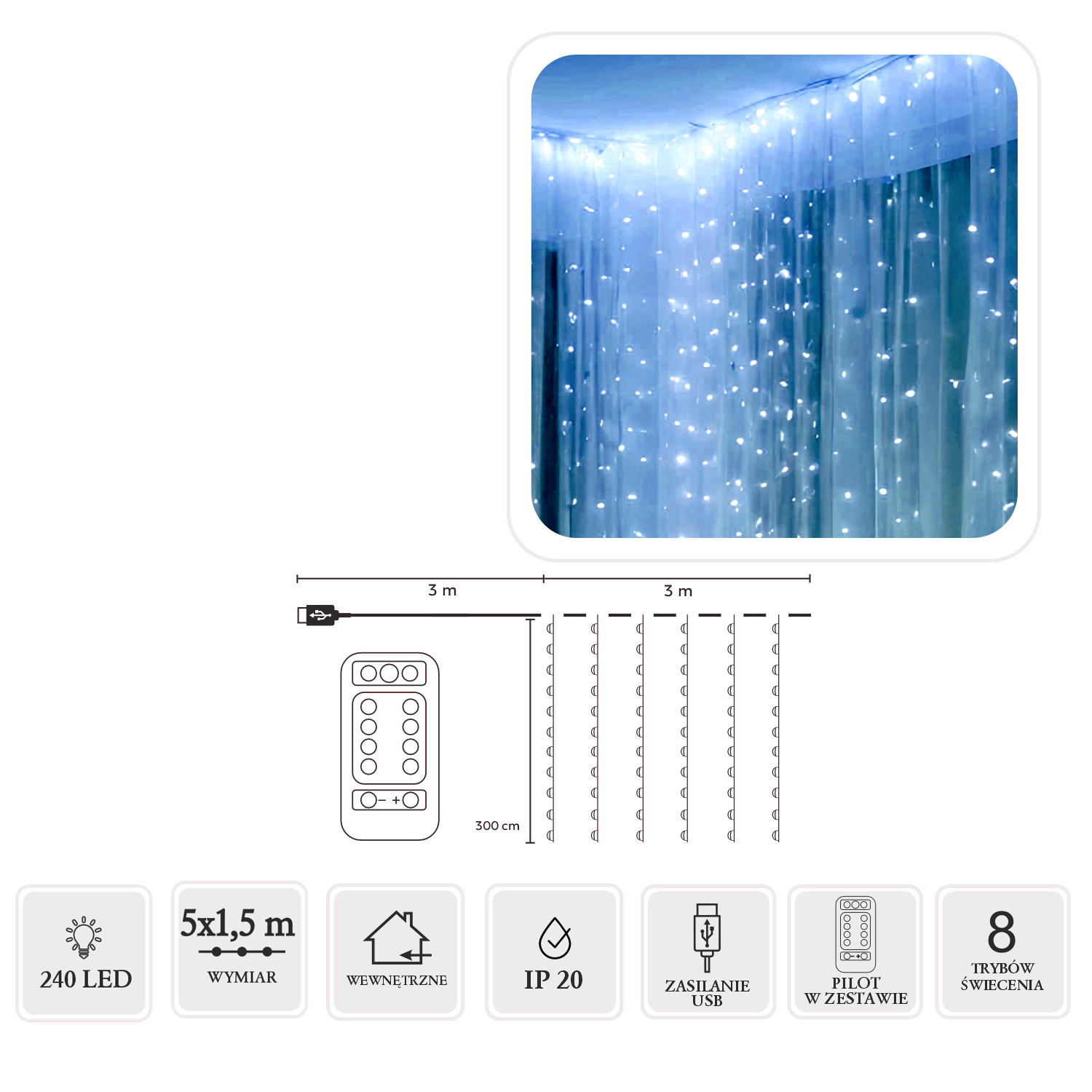 Vybrané modely nabízejí praktické funkce pro pohodlné používání: časovač (např. 6/18 h), paměť posledního režimu, dálkové ovládání a možnost stmívání. Různé délky a počty LED, více světelných režimů (stálé svícení, wave, flash, twinkle) a napájení USB nebo 230 V vám dávají svobodu instalace. Pro venkovní dekorace oceníte krytí IP44/IP65 dle modelu, odolné kabely a bezpečné nízké napětí – LED závěsy jsou vhodné na balkon, terasu i fasádu.