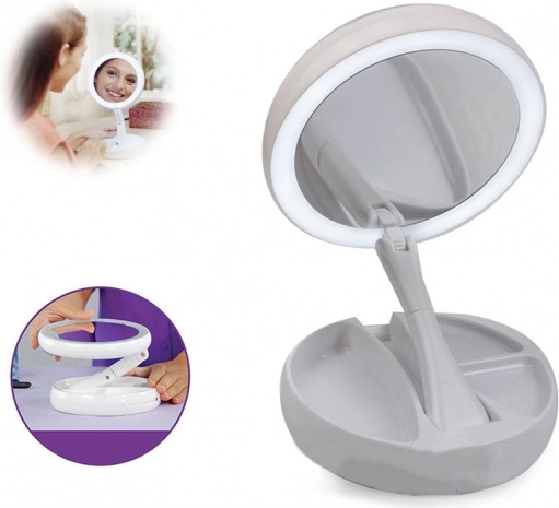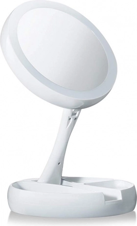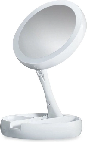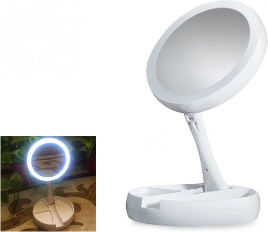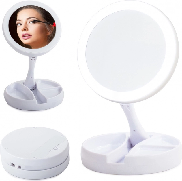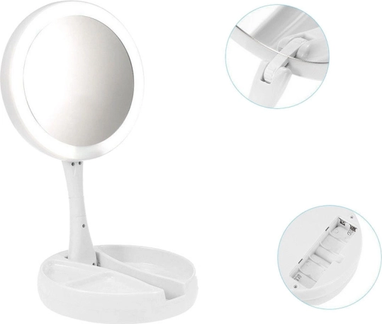 Stabilní podstavec se zásobníky na drobnosti udrží po ruce štětce, pinzetu či rtěnku. Konstrukce se sklápěním/otočením o 180° usnadní nastavení ideálního úhlu. Napájení je flexibilní: baterie 4× AA nebo přes 5 V Micro USB – perfektní pro domácí toaletní stolek i cestování.