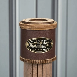 Dřevěný tubus s koženým pruhem a kovovým štítkem dodává modelu vintage vzhled, který ozdobí každý interiér.