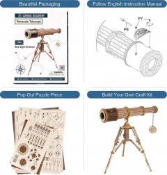 Objevte kouzlo konstrukce s 3D dřevěným modelem monokulárního dalekohledu ROBOTIME Rokr. Tento krásně zdobený dalekohled nabízí trojnásobné zvětšení a skutečnou dohledovou vzdálenost až 150 metrů, což z něj činí ideální dekorativní i funkční prvek.