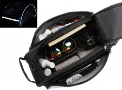 Reflexní proužky pro větší bezpečnost a přídavný popruh pro nošení přes rameno.