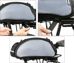 Gumové zarážky na klopě umožňují bezpečné uložení bundy či láhve, zatímco reflexní proužky zvyšují vaši bezpečnost na silnicích. Univerzální design padne na většinu nosičů kol a díky nastavitelným přezkám je montáž rychlá a snadná.