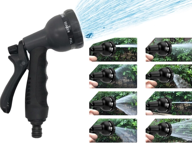 Součástí balení je také multifunkční stříkací pistole s osmi režimy spreje. Snadné uzamčení spouště pomocí kovového háčku vám umožní plynule potřebovat vodu, aniž byste museli držet stlačenou páku. Ergonomická protiskluzová rukojeť zajistí pohodlné a bezpečné uchopení.