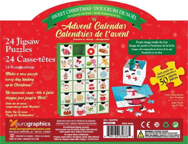 Adventní kalendář EUROGRAPHICS „Sladké Vánoce“ promění prosinec v hravou tradici. Každý z 24 šuplíčků ukrývá čtvercové puzzle o 50 dílcích s lahodnými motivy cukrovinek. Obrázky mají rozměr 12,5 × 12,5 cm a předloha je vytištěna na zadní straně každého šuplíku pro snadné skládání.