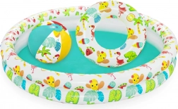 Set obsahuje nafukovací bazének, plavací kruh a plážový míč – vše sladěné v hravém tropickém designu. Děti mají ihned vše po ruce pro bezpečné vodní radovánky.