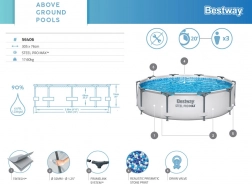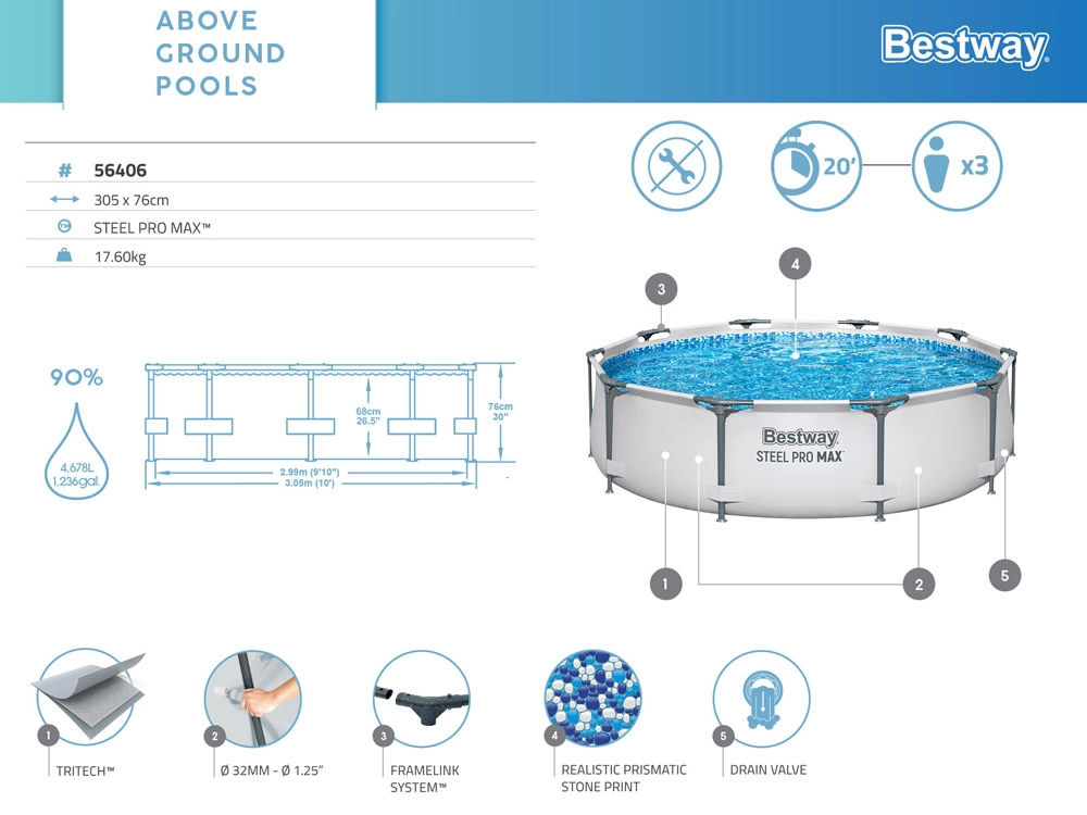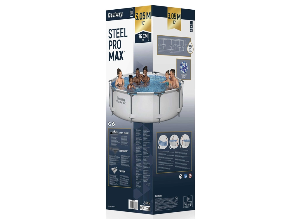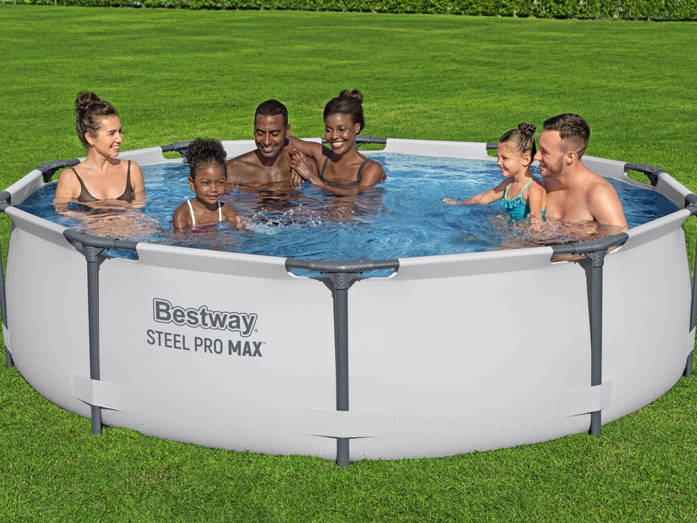 Kvalitní nadzemní bazén BESTWAY Steel Pro Max nabízí skvělý poměr ceny a výkonu pro každodenní letní koupání. Třívrstvý materiál Tritech je vyztužen polyesterovou síťovinou a dvěma vrstvami PVC pro vyšší odolnost proti protržení, roztažení i propíchnutí. Ocelový rám s úpravou proti korozi spolu se systémem FrameLink minimalizuje tření kovových částí a zvyšuje životnost.