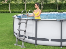 Bezpečnost zvyšuje odnímatelný žebřík, díky kterému lze zabránit samovolnému vstupu dětí bez dozoru. O čistotu vody se stará filtrační pumpa s kartuší (typ II), zatímco průtokové vypouštěcí ventily usnadní rychlé vypuštění vody po sezóně. Snadná montáž, stabilní konstrukce a bohaté příslušenství vytvářejí ideální řešení pro rodinné koupání na zahradě.