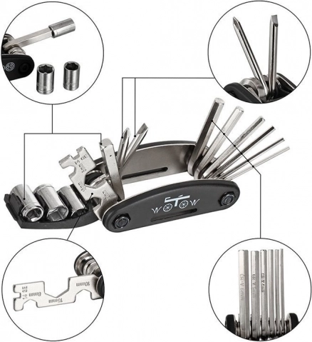 Vše potřebné na jednom místě: imbusy, šroubováky, nástrčné klíče i klíč na paprsky. Ideální pro rychlé opravy a seřízení kola kdekoliv.