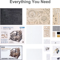 ROKR Marble Night City je ohromující 3D skládací model kuličkové dráhy, který kombinuje zábavu a vzdělání. Tento model se skládá z 294 precizně vyřezaných dílků, které tvoří složitou dráhu s různými překážkami a mechanikou poháněnou ručně otáčením klikou. Součástí balení je kompletní manuál, který vás provede procesem skládání.