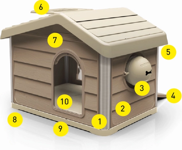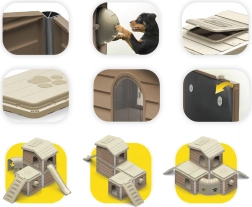 Modulární systém ze 6 hlavních dílů umožňuje snadnou montáž i demontáž bez nářadí, díky čemuž je domek ideální na zahradu, terasu i pro přenášení. Interaktivní dávkovač suchého krmiva podporuje pomalejší a zdravější stravování a zábavnou formou stimuluje přirozené instinkty psa či kočky.