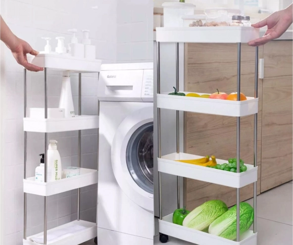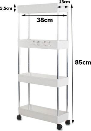 Skříňka je navržena pro efektivní využití prostoru ve vaší domácnosti. Čtyři police nabízí dostatek úložného prostoru pro toaletní potřeby v koupelně nebo potraviny v kuchyni. Díky kolečkům je snadno přemístitelná a multifunkční, takže si můžete přizpůsobit její použití podle vlastních potřeb.