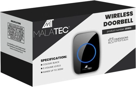 Bezdrátový zvonek Malatec je moderní zařízení, které vám poskytne spolehlivé oznámení návštěvníků díky širokému dosahu až 300 metrů. Má elegantní černý design a je vyroben z odolného ABS plastu. Díky své vodotěsné úpravě (IP44) je schopen odolat i dešti a sněhu.