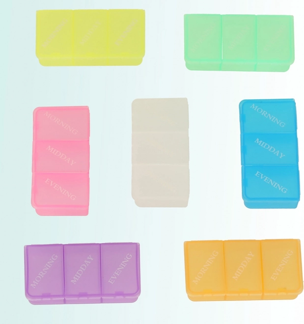 Každý pojemník je barevně odlišený a opatřený nálepkami, které usnadňují identifikaci dne, pro který je určen. Praktické balení ideální na cestování nebo každodenní použití.