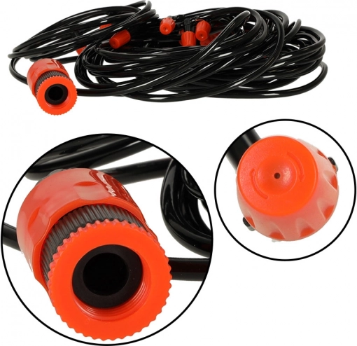 Hadici snadno připojíte k běžné zahradní hadici nebo přímo ke kohoutku. Regulace průtoku na tryskách umožňuje přizpůsobit intenzitu mlhy různým místům. Díky možnosti zkrácení hadice upravíte rozteče trysek přesně podle svých potřeb a vodu nasměrujete tam, kde je to nejvíc potřeba.