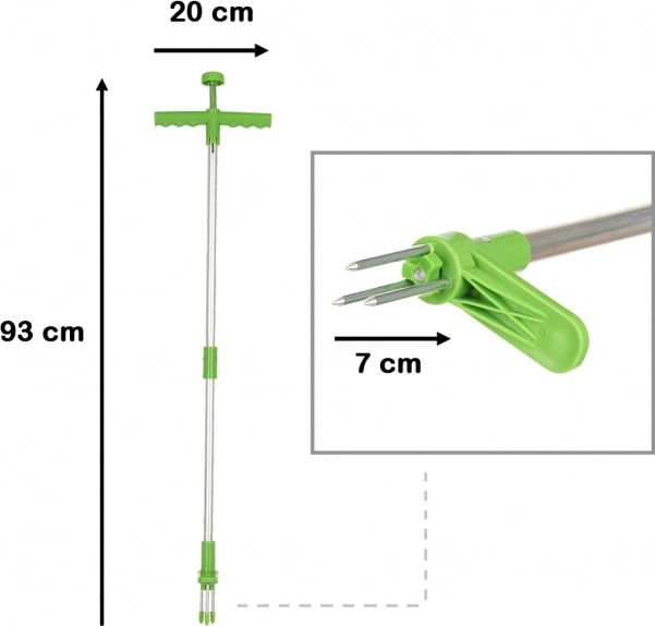 Tříhrotý mechanizmus uchopí plevel z více stran, pevně jej sevře a umožní jeho vytažení i s kořeny. Stačí nasměrovat hroty na střed rostliny, zatlačit, mírně pootočit a vytáhnout. Praktické tlačítko v horní části usnadní sejmutí vytrženého plevele z nástroje.