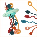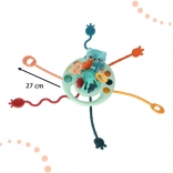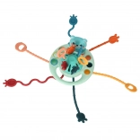 Tato barevná senzorická hračka inspirovaná pedagogikou MONTESSORI nabízí dětem pestrou paletu podnětů: pružné silikonové šňůrky různých barev a struktur k přetahování, tlačítka/korálky k mačkání a kroužek k posouvání. Díky bezpečným materiálům je vhodná i jako kousátko při prořezávání zoubků.