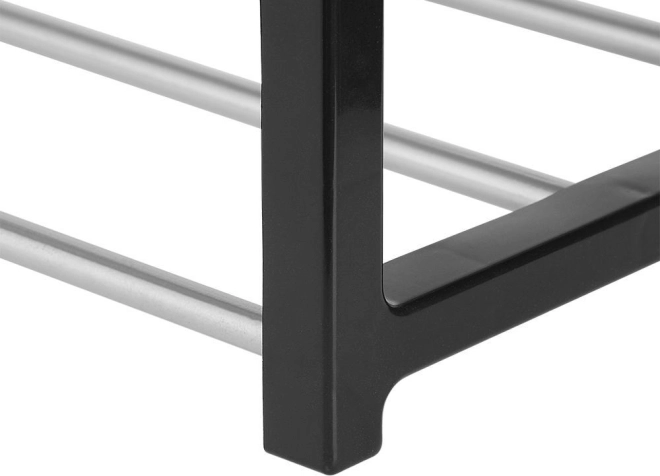 Moderní design s černými plastovými sloupky a chromovými hliníkovými příčkami.