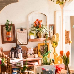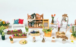 Miniaturní květiny, nábytek, polštáře a doplňky vytvářejí věrnou atmosféru zahradní terasy – ideální jako stylová dekorace domova.