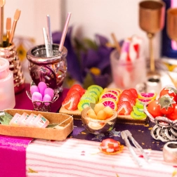 Miniatura obsahuje detailní prvky, jako jsou barevné židle, stoly a další dekorace, které věrně napodobují skutečné prostředí.