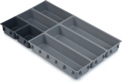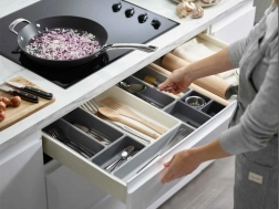 Více velikostí přihrádek pojme lžíce, vidličky, nože i drobné kuchyňské pomůcky, aby byly vždy rychle po ruce.