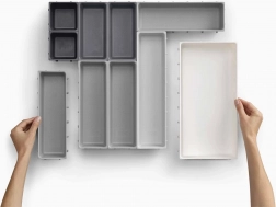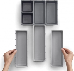 Sada obsahuje 10 kontejnerů různých velikostí, které jednoduše spojíte pomocí integrovaných háčků. Díky kompaktním rozměrům skvěle padne do většiny standardních zásuvek a vytvoří přehledný systém pro příbory, nože, metličky, škrabky i kancelářské či kreativní drobnosti.