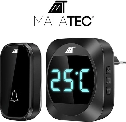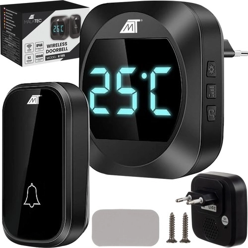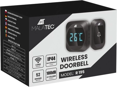 SPECIFIKACE - barva: černá; displej LCD: ano; zobrazení teploty: °C / F; napájení tlačítek: baterie (baterie je součástí dodávky); napájení vyzvánění: síť; pětistupňová regulace hlasitosti; hlasitost: 100 dB; na výběr 52 polyfonních tónů; dosah: 200 m (může se snížit, pokud narazí na překážky); vodotěsnost: IP44; celkové ztlumení: ano; rozměry vyzvánění: Rozměry: 7,5 x 4,5 x 1,7 cm; rozměry přijímače: 7,5 x 4,5 x 1,7 cm: Hmotnost: 0,100 kg; hmotnost v balení: 0,163 kg.