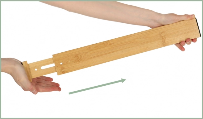 Bambusová dělící přepážka nejenže udrží vaše zásuvky uspořádané, ale také jim dodá estetický vzhled. Přepážka je vybavena ochrannými polštáři na okrajích, které chrání zásuvku před poškrábáním a zabraňují pohybu organizéru při vysouvání. Použití je velmi jednoduché – stačí vybrat zásuvku, stlačit přepážku na nejmenší rozměr a umístit ji do požadovaného místa. Produkt se přizpůsobí tvaru vaší zásuvky automaticky.