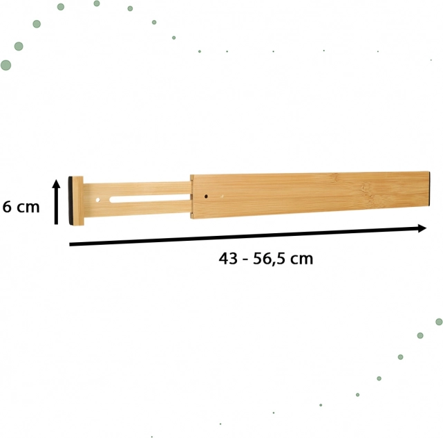 Představujeme vám užitečného pomocníka pro každodenní organizaci prostoru ve vaší domácnosti. Tento bambusový organizér umožňuje snadné rozdělení produktů v jedné zásuvce, a to díky své nastavitelné délce od 43 do 56,5 centimetrů. Je univerzální a lze ho používat v kuchyni, koupelně nebo skříni, a to i ve větších zásuvkách.