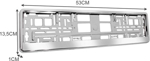 Obsah balení: 2x rámeček na registrační značky s rozměry 53 x 13,5 x 1 cm a váhou 381 g každý, celková váha balení 538 g.