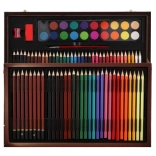 Objevte kompletní uměleckou výbavu, ideální pro malé i větší umělce. Tato praktická sada v elegantním dřevěném kufříku nabízí vše potřebné k malování a kreslení, včetně pastelek, ořezávátka, gumy a vodových barev, celkem 91 kusů.