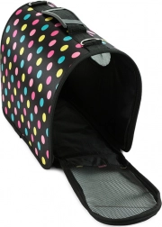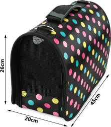 Tento produkt je vhodný pro různé druhy zvířat jako jsou králíky, fretky, morčata, kočky a psi. Barva tašky je černá s puntíky.