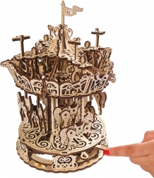 Udělejte si radost elegantním kolotočem z kvalitní překližky, který spojuje nostalgii s chytrou mechanikou. Díky gumovému natahovacímu pohonu se středový sloup a stříška točí opačným směrem, čímž vytváří optickou iluzi vysoké rychlosti. Koníci plynule stoupají a klesají a nad kolotočem krouží drobní ptáčci – to vše je krásně vidět díky otevřenému designu.