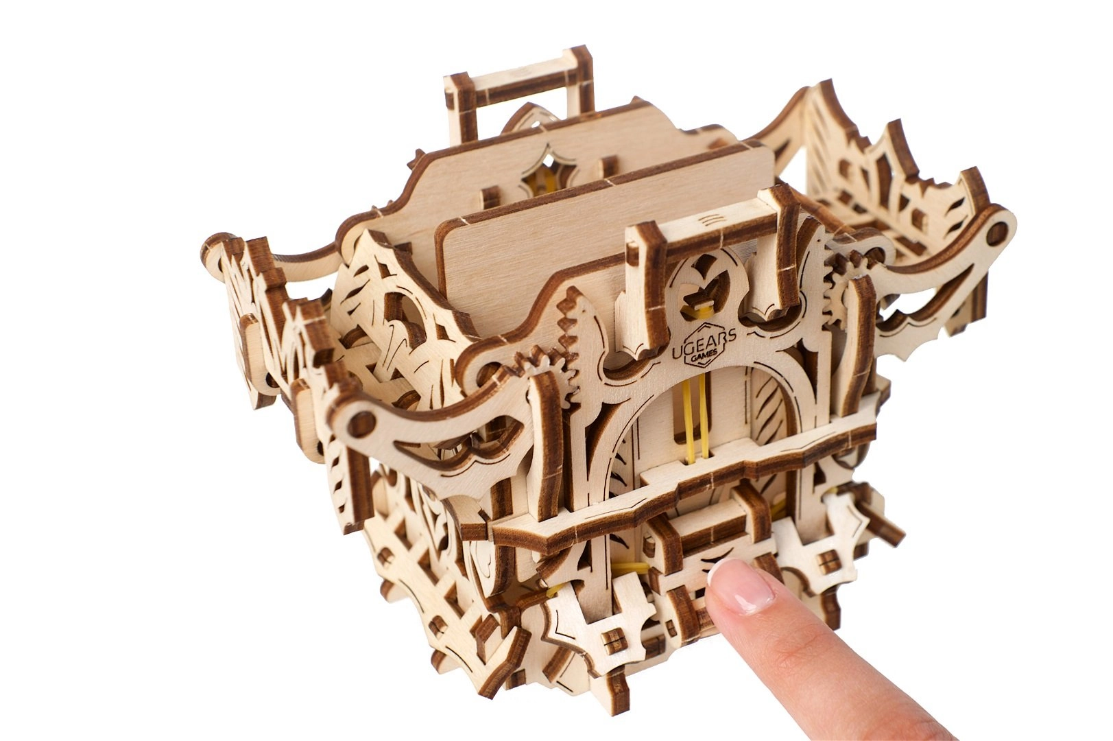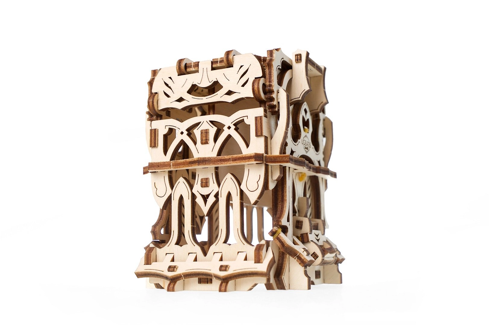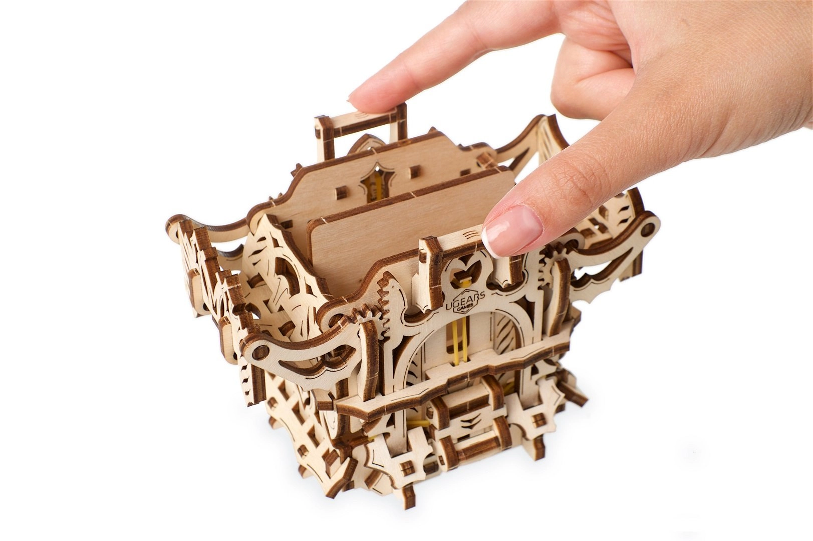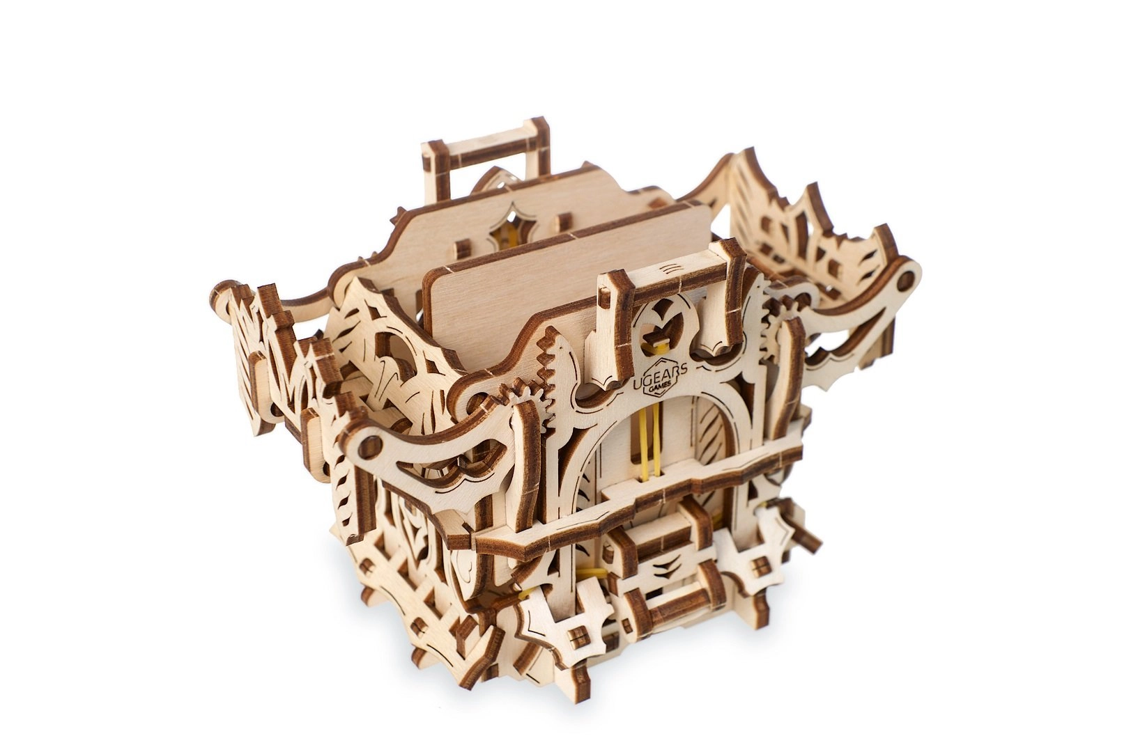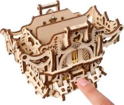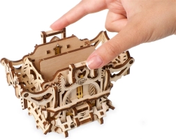 Elegantní dřevěná schránka na karty od UGEARS spojuje mechanický model a praktické úložiště pro vaše balíčky. Obsahuje dvě přihrádky pro až 120 karet standardní velikosti, otevírá se stiskem horních výstupků a zavírá tlačítkem u paty konstrukce. Model z přírodní překližky vyniká fantasy dekoracemi, lze jej snadno sestavit bez lepidla a případně dobarvit akvarely.