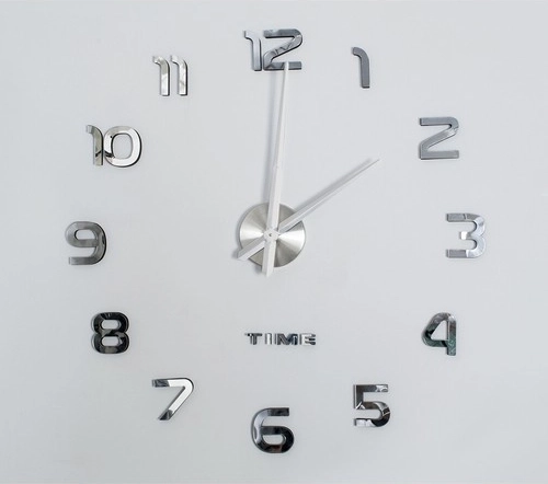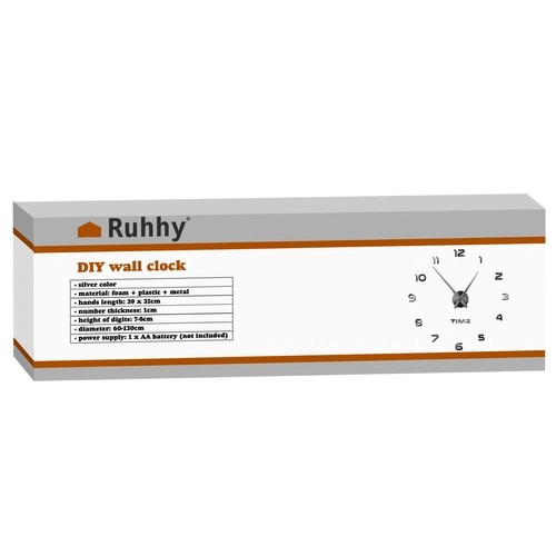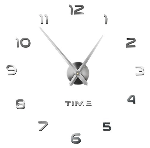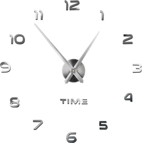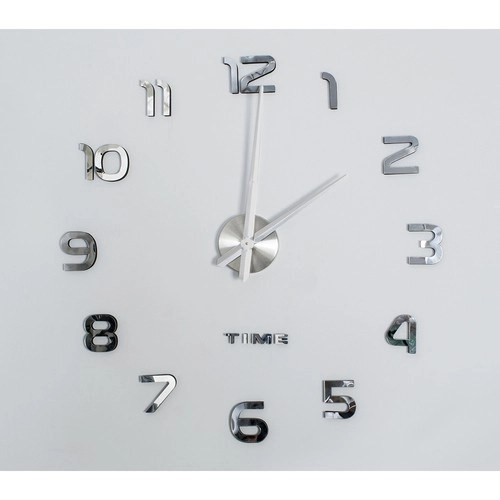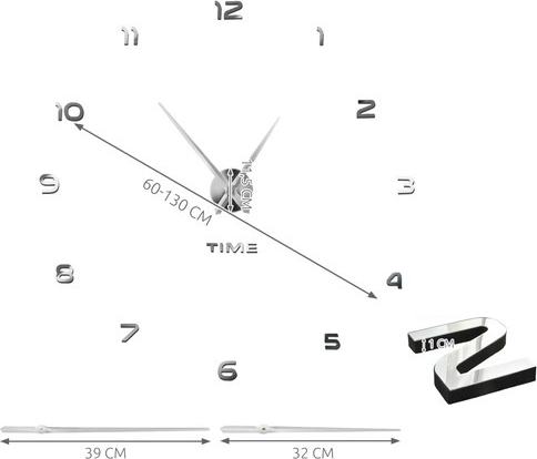 Moderní nástěnné hodiny pro samostatnou montáž s nastavitelným průměrem 60–130 cm ozdobí každý interiér. Lesklé stříbrné 3D číslice s zrcadlovým efektem vytvářejí elegantní design, tichý plynulý chod bez tikání zajišťuje klid v obýváku i ložnici. Díky přiložené šabloně a samolepicím číslům je montáž rychlá a snadná. Napájení na 1× AA baterii (není součástí).
