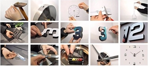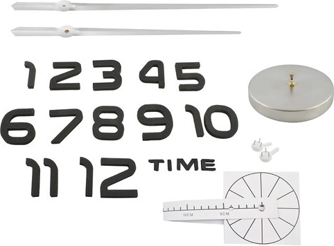 - 3D číslice a nápis, zrcadlové krytky, hodinový mechanismus s ručičkami, papírová montážní šablona, háčky