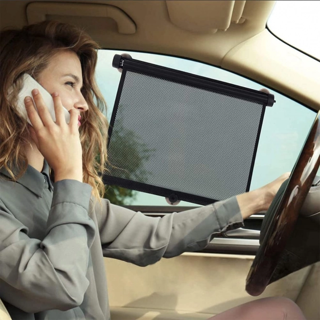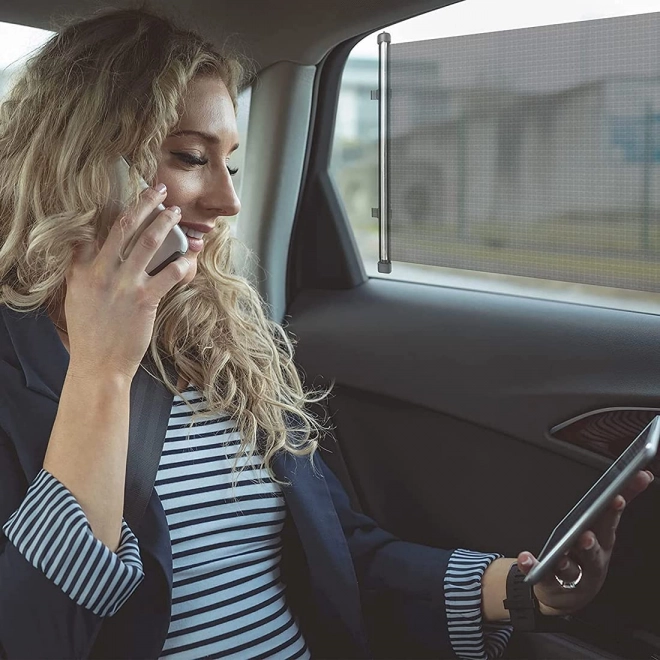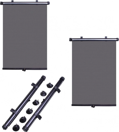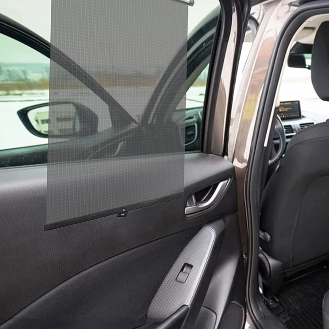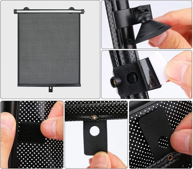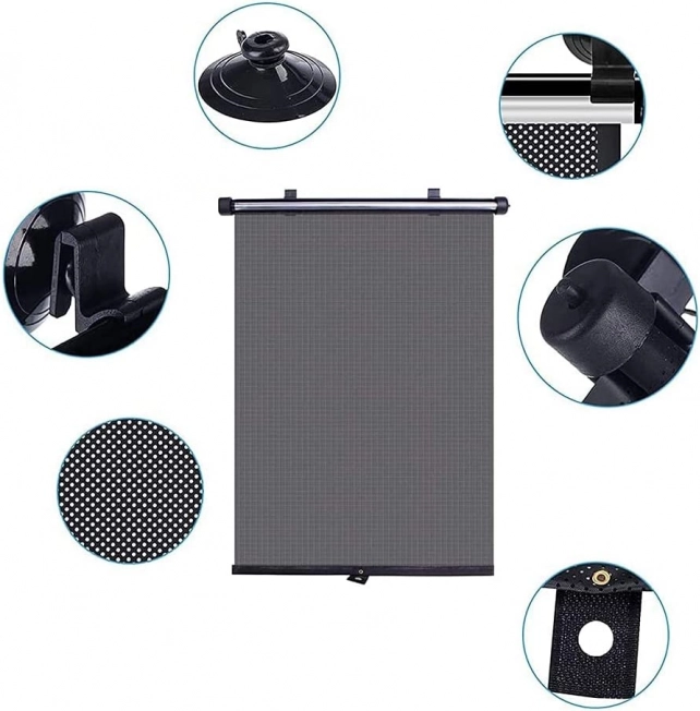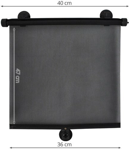 Rolovací stínítko do auta - chrání dítě před přímým slunečním zářením. Lze snadno namontovat: tubus rolety pomocí dvou přísavek připevněte k horní části okna. Vytáhnete roletku a připevněte přísavkou k dolní části okna. Chcete-li stínítko vytáhnout, uvolněte dolní přísavku a stiskněte tlačítko na pravé straně tubusu.