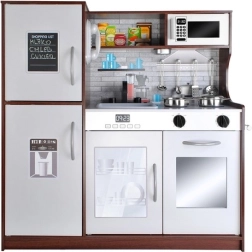 Součástí je kovové nádobí a náčiní: hrnec, pánev, poklice a 4 kuchyňské lžíce (naběračka, na špagety, cedník, naběračka na těstoviny). Vyjímatelný dřez umožní po hře „umyvat“ nádobí. Nadčasový design v kombinaci tmavé hnědé a bílé se hodí do každého dětského pokoje.