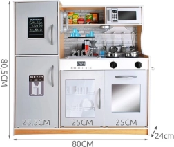 Kuchyňka je vyrobena z kvalitního dřeva, díky čemuž je stabilní, odolná a bezpečná. Součástí je bohaté kovové příslušenství – hrnec, pánev, poklice a 4 kuchyňské nástroje – a vyjímatelný dřez pro snadné „mytí“ nádobí. Neutrální design a barvy se hodí pro holky i kluky.