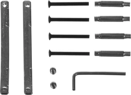 - 2× klika, 2× rozeta na klíč, průchozí montážní šrouby, vruty, 2× trn, imbusové šrouby, imbusový klíč