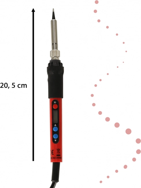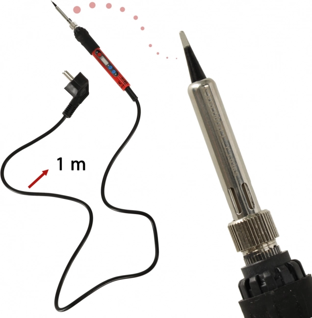 **Technické parametry:** - **Výkon:** 80 W - **Napájení:** 110-230 V - **Regulace teploty:** Ano (s pomocí dvou tlačítek) - **Vypínač:** Ano - **Rozměry lutovacího pera:** 20,5 cm x 2,5 cm - **Délka hrotu:** 1,5 cm - **Délka kabelu:** 1 m - **Rozměry balení:** 31,5 cm x 8,2 cm x 4,5 cm