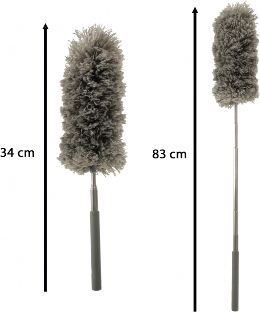 Prachovka s teleskopickou rukojetí nabízí řešení pro rychlé a efektivní odstranění prachu z jakéhokoli povrchu. Díky své prodloužitelné konstrukci, kterou lze natáhnout až na 83 centimetrů, snadno dosáhne na vysoké a vzdálené oblasti, aniž byste potřebovali žebřík.