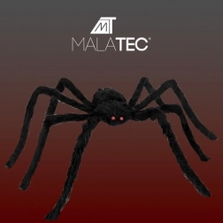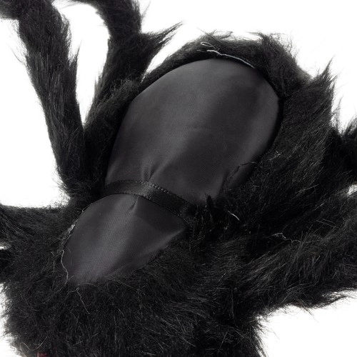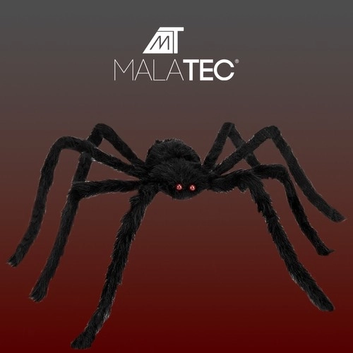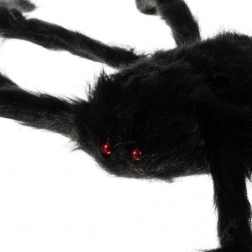 Černé chlupaté tělo a sytě červené oči navodí autentickou halloweenskou atmosféru – ideální pro párty, výlohy, tematické trasy i fotokoutky.
