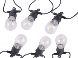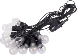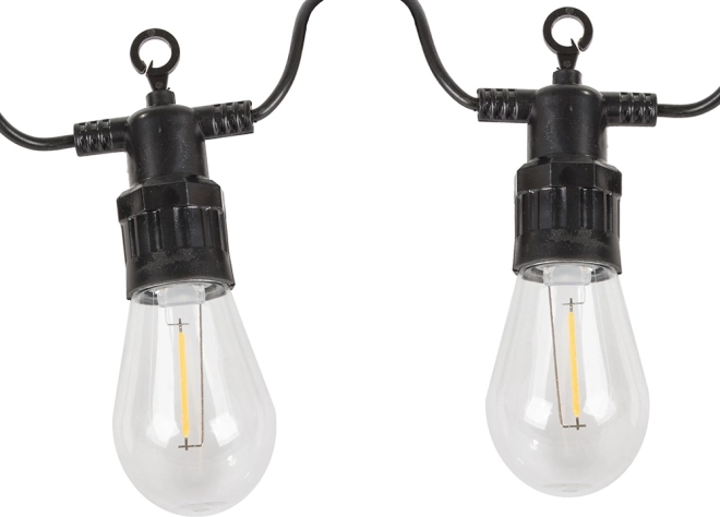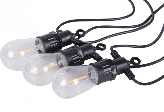 Řetěz je zakončen těsným propojovacím šroubením, takže můžete snadno spojit více girland a přizpůsobit délku svým potřebám. Průhledné kryty žárovek jsou z odolného plastu, který je lehký a praktický pro časté přemísťování i sezónní používání.