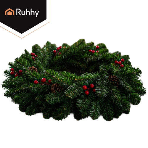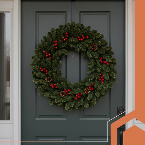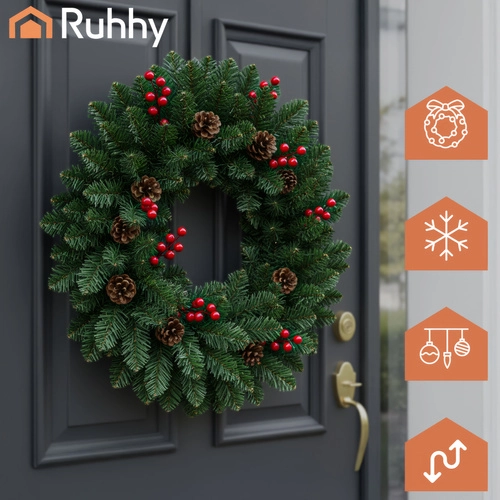 Elegantní kombinace zeleného jehličí, červených bobulí a přírodně působících šišek vytváří výraznou sváteční dekoraci pro dveře, stěny i římsy.