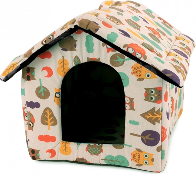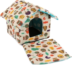 Domeček je lehký a snadno přenosný, takže si jej vezmete i na cesty a mazlíček se bude cítit jako doma. Odolný potah je příjemný na dotek, nezachytává chlupy a je odolný vůči poškrábání. Design se sovičkami oživí interiér a vytvoří útulné místo k odpočinku.