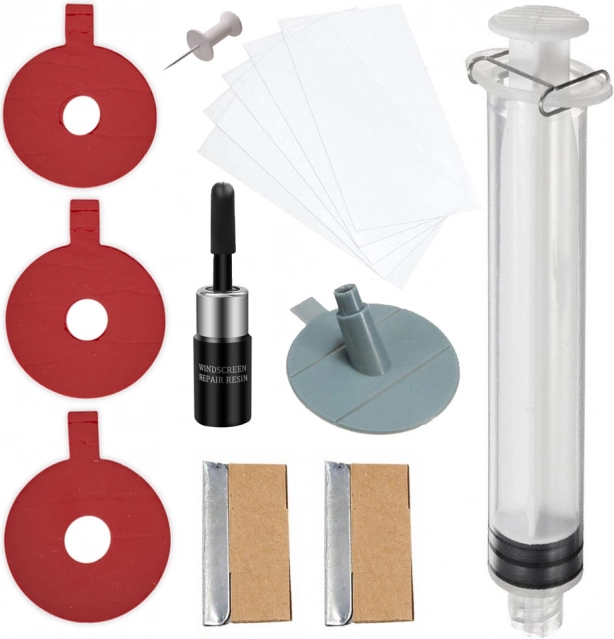 Součástí balení je vše potřebné: aplikátor se šroubem pro vytvoření podtlaku, stříkačka, vytvrzovací fólie i žiletka pro finální srovnání povrchu. Oprava probíhá pod UV světlem nebo na přímém slunci, takže výsledek je rychlý, pevný a dlouhodobý.