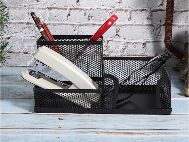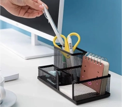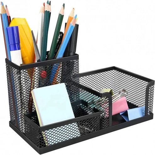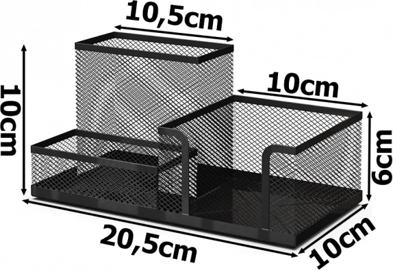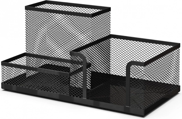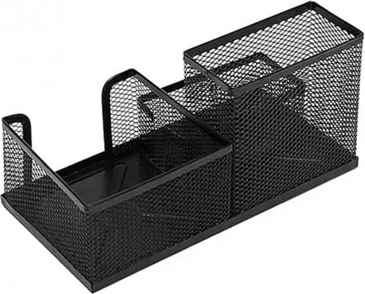 Objevte výhody organizace s naším černým síťovaným stolním organizérem. Jeho lehce vážená kovová konstrukce je navržena tak, aby váš pracovní prostor zůstal čistý a efektivní. Tři prostorné přihrádky pomáhají uspořádat všechny druhy kancelářských potřeb, což vám umožní se plně soustředit na práci a zvýšit produktivitu.