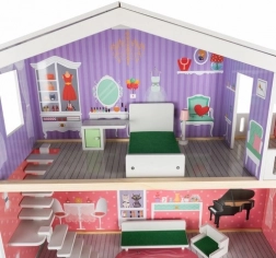 Stavba z MDF a borovicového dřeva zaručuje odolnost a stabilitu. Funkční výtah ovládaný kličkou posouvá panenky mezi patry, zatímco bohatá sada nábytku umožňuje okamžitě začít s hraním.