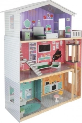 Velký dřevěný domeček pro panenky KRUZZEL o výšce 114 cm nabízí 3 patra, 4 pokoje a balkon, funkční výtah na kličku a bohaté vybavení nábytkem. Díky stabilní konstrukci z MDF a dřeva je bezpečný, pečlivě opracovaný a láká k kreativní hře plné fantazie.
