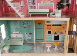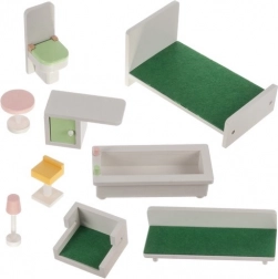 - Domeček, postel, toaletní stolek, toaleta, vana, sofa, křeslo, stolek, hoker (barová židle), lampička, schody